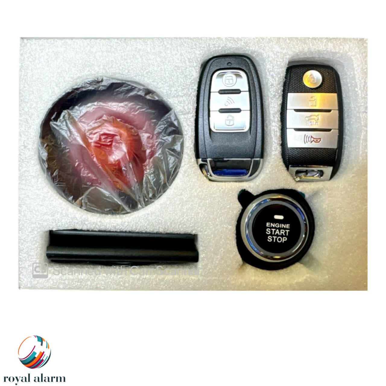 کیت دستگاه - 2 عدد ریموت - آژیر - سیم کشی - شوک سنسور - آنتن PKE - دکمه استارت- ال دی دزد گیر ( چشمک زن )